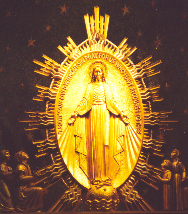 After a moment, the apparition changed. The Virgin Mary was now standing on a globe with a serpent beneath her feet. Her arms were outstretched. An oval shape framed the Blessed Virgin, and on it were written these words in gold: "O Mary, conceived without sin, pray for us who have recourse to thee." This was to be the front of the medal Mary desired to be made.